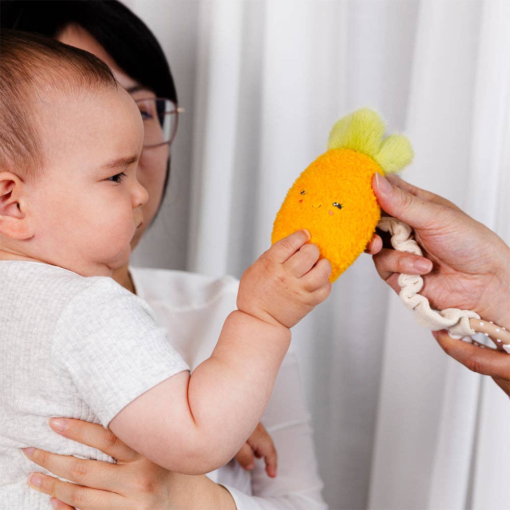 Keep your little one entertained when out and about with our gorgeous Mini Market Brunch stroller toys. Our Carrot & Green Peas is made from polyester plush and features a soft rattle to enhance the play experience. They attach easily to any stroller/pram hood, bumper bar, or even baby's play-gym or car seat.