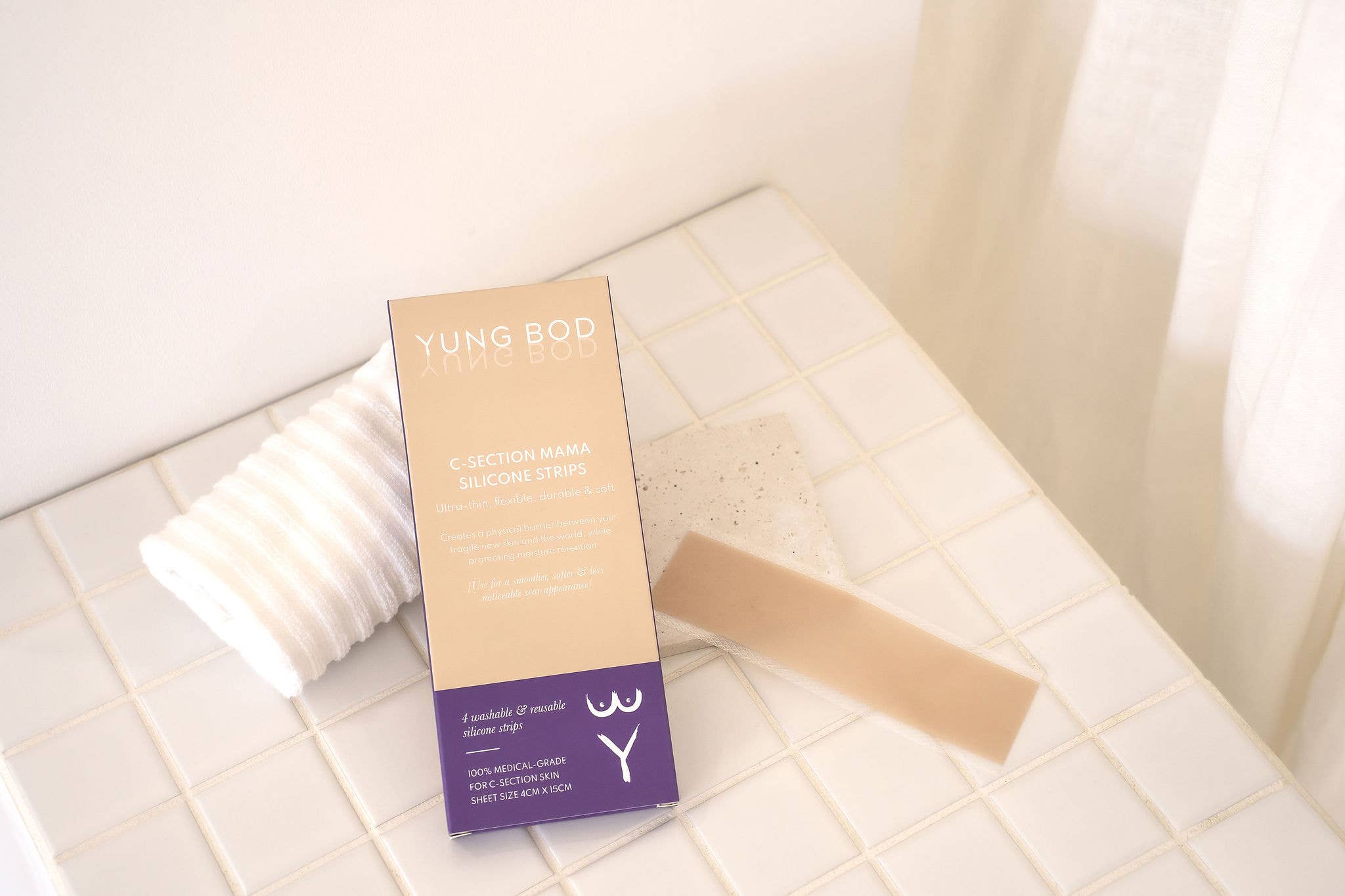 Please welcome to the stage, YUNG BOD C-Section Silicone Strips! Oh… we’re talking about silicone strips (not the verb and how we ended up pregnant). Silicone can be used for improving the appearance and textures of scars, and is often recommended by healthcare professionals. and labelled as the ‘gold standard’ of scar treatment. You can use these silicone strips once your practitioner gives you the okay to apply topical products to your c-section skin - this is usually at your six-week check up. These silicone strips create a physical barrier between your fragile new skin and the world, while promoting moisture retention. This contributes to a smoother, softer, and less noticeable scar appearance.