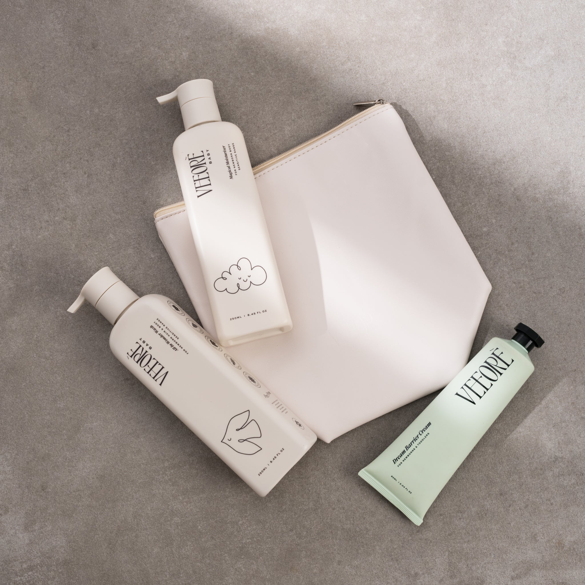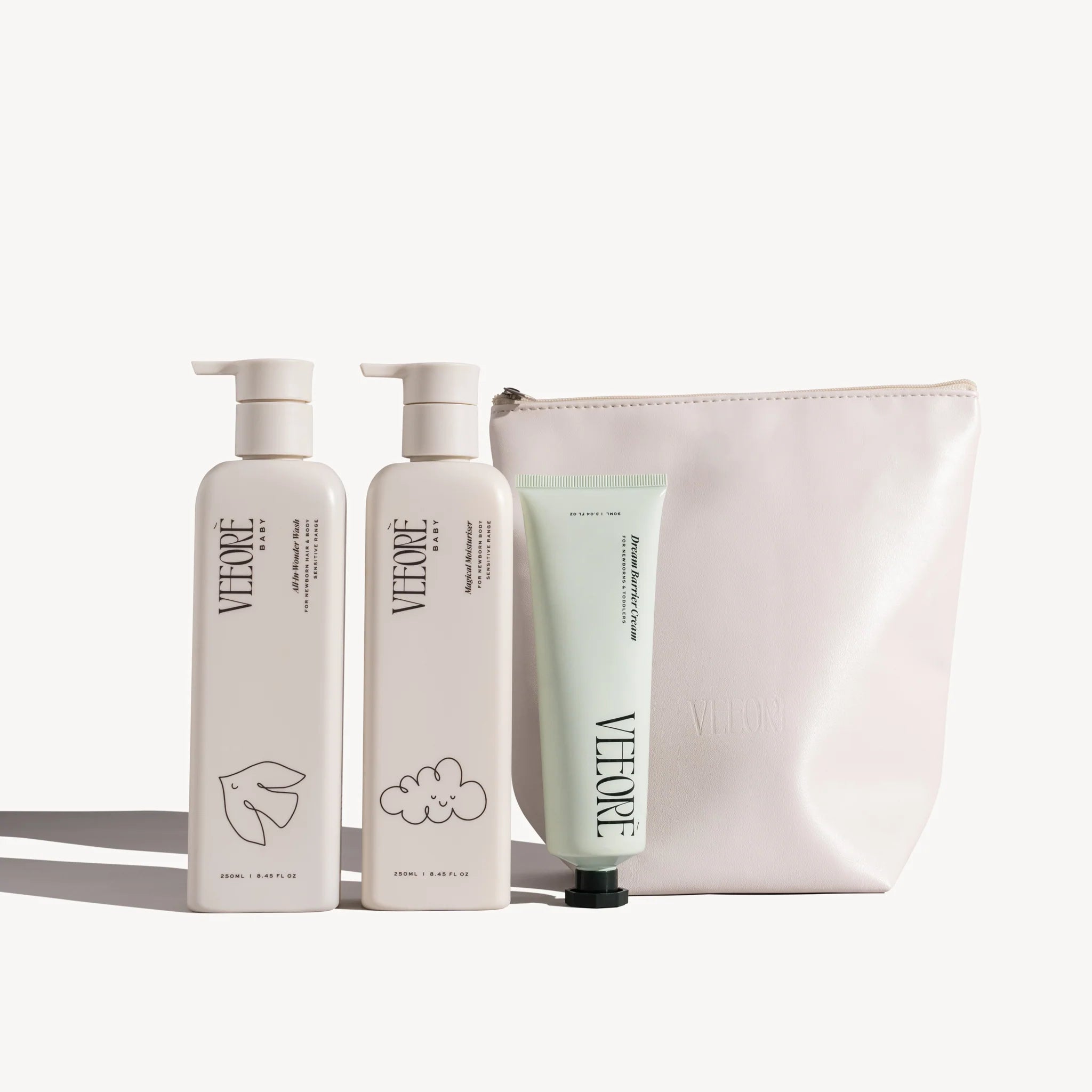 Crafted with science-backed care, our Full-Size Bundle offers everything needed to cleanse, soothe, and nourish your baby’s delicate skin in one thoughtfully curated set. Filled with three essentials and a large travel bag—perfect for your little one and you. Each product is dermatologist-tested, made with Veeorè’s signature aloe-based hydration, and infused with our unique trio-ceramides to support baby’s natural skin barrier. Perfect for keeping your little one’s skin soft, balanced, and protected, this bundle is an ideal introduction to gentle, effective baby skincare.