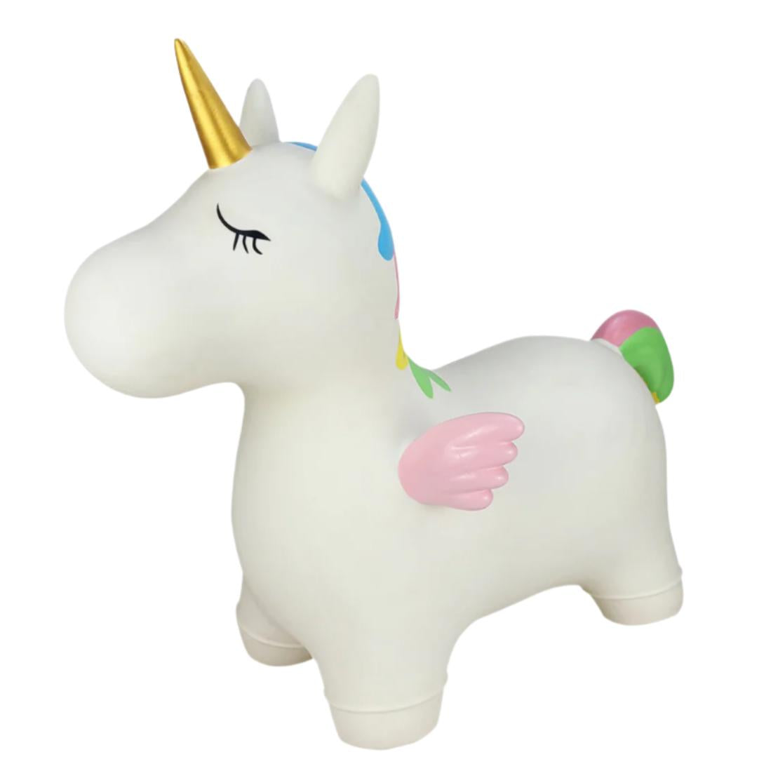 Introducing Bouncy Rider Stardust the Unicorn by Kaper Kidz an enchanting inflatable ride-on that sparks imagination and adventure. With its captivating white colour and graceful design, Stardust embodies the magic of a unicorn. Designed for both durability and safety, it offers a comfortable riding experience with sturdy construction and secure grip handles. Let your child's imagination soar as they embark on extraordinary adventures with Bouncy Rider Stardust the Unicorn is a magical companion for endless playtime. This toy come complete with a free hand pump and complies with EN71 & CPSIA, Phthalates and PAHs free. This toy hold a max weight 50kg.