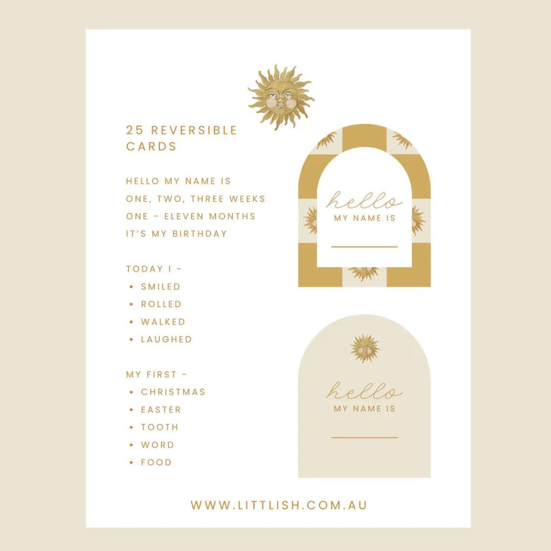 Refresh availabilityCapture every precious moment of your baby's first year with our Golden Sun + Ochre Reversible Baby Milestone Cards. These beautifully designed cards are perfect for baby announcements and documenting all the little milestones from birth to one year. Featuring a charming and fun golden sun design, each card adds a touch of sunny cheer to your baby's photos. Packaged in a beautiful cardboard box, these milestone cards are a keepsake you’ll treasure forever.