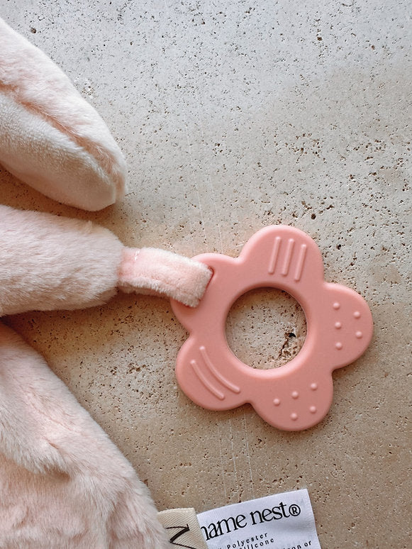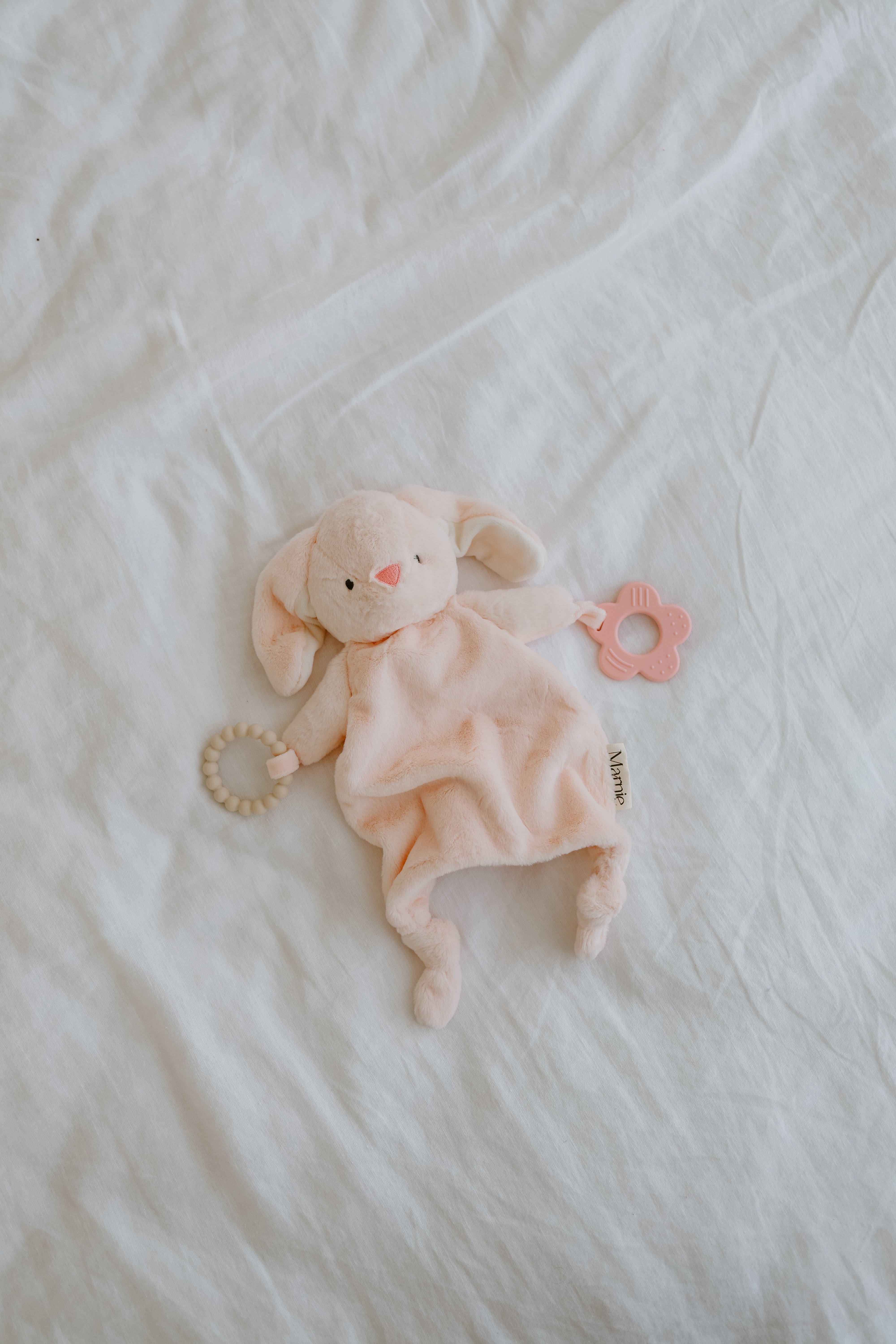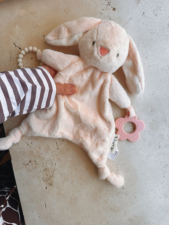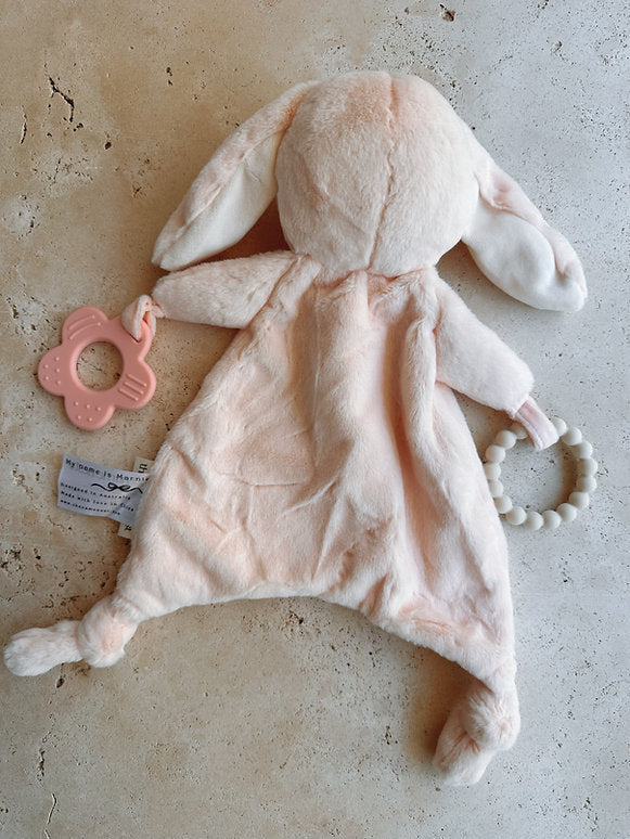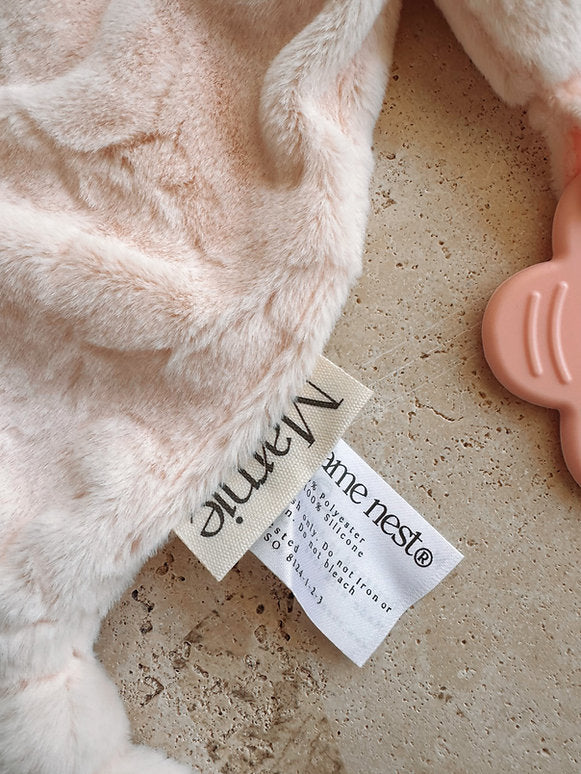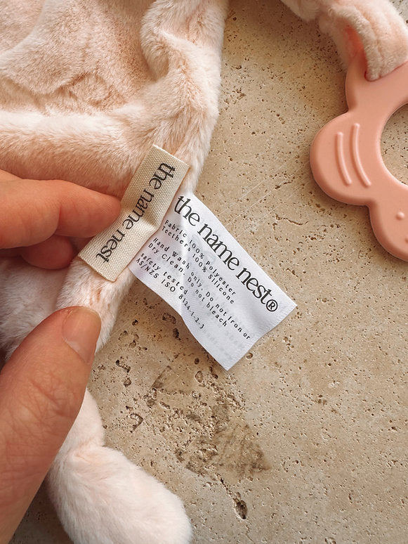 Beautifully buttery soft Marnie comforter makes the most beautiful friend for your little one. Made from a plush and wonderfully soft fabric in our name nest Signature peach colour, featuring two food grade silicone teethers for your little one to chew, with velvety soft ears and body. Your Marnie will become a very loved and cherished friend for years to come!