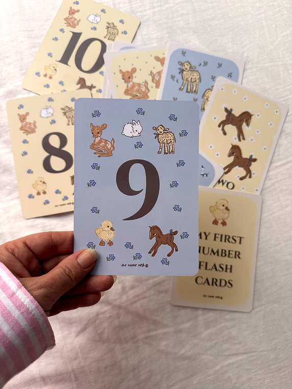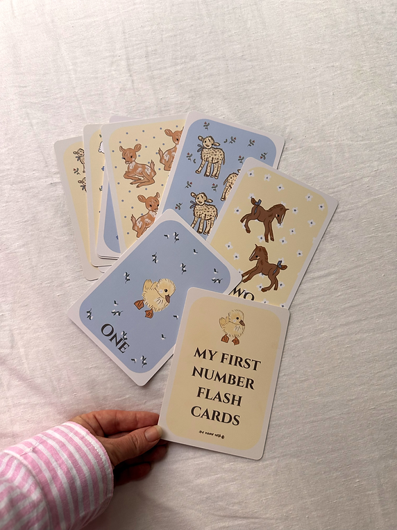 Each deck contains 11 beautiful double sided cards, featuring numbers 1-10 for your little one's learning journey. Each number features a cute little farm animal, making it a fun game to count each while learning numbers!