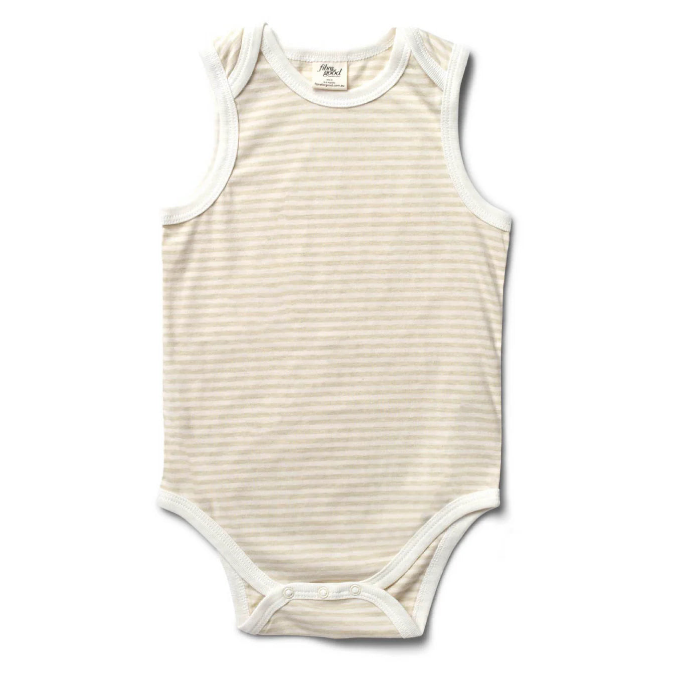 Soft undyed organic cotton jersey bodysuit with natural stripes. Breathable and chemical-free for delicate newborn skin. Quick-snap closures for easy dressing. Perfect for warm days or layering in cooler months.