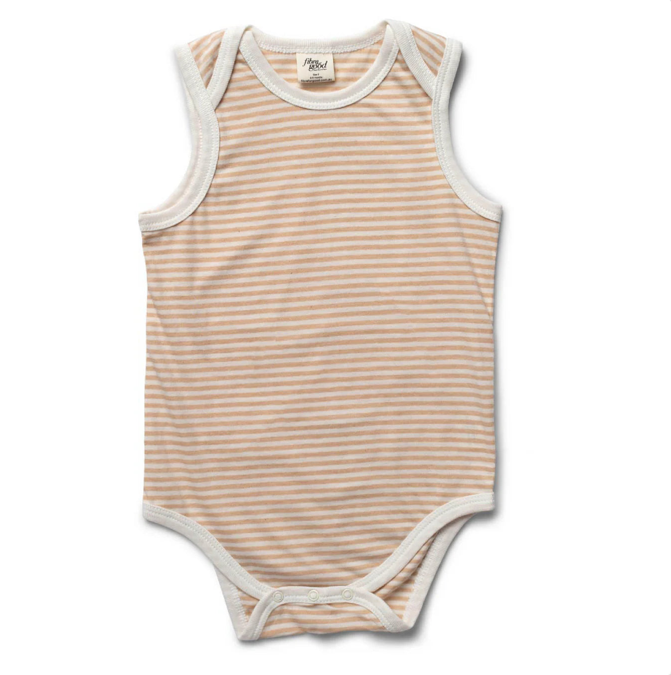 Soft undyed organic cotton jersey bodysuit with natural stripes. Breathable and chemical-free for delicate newborn skin. Quick-snap closures for easy dressing. Perfect for warm days or layering in cooler months.