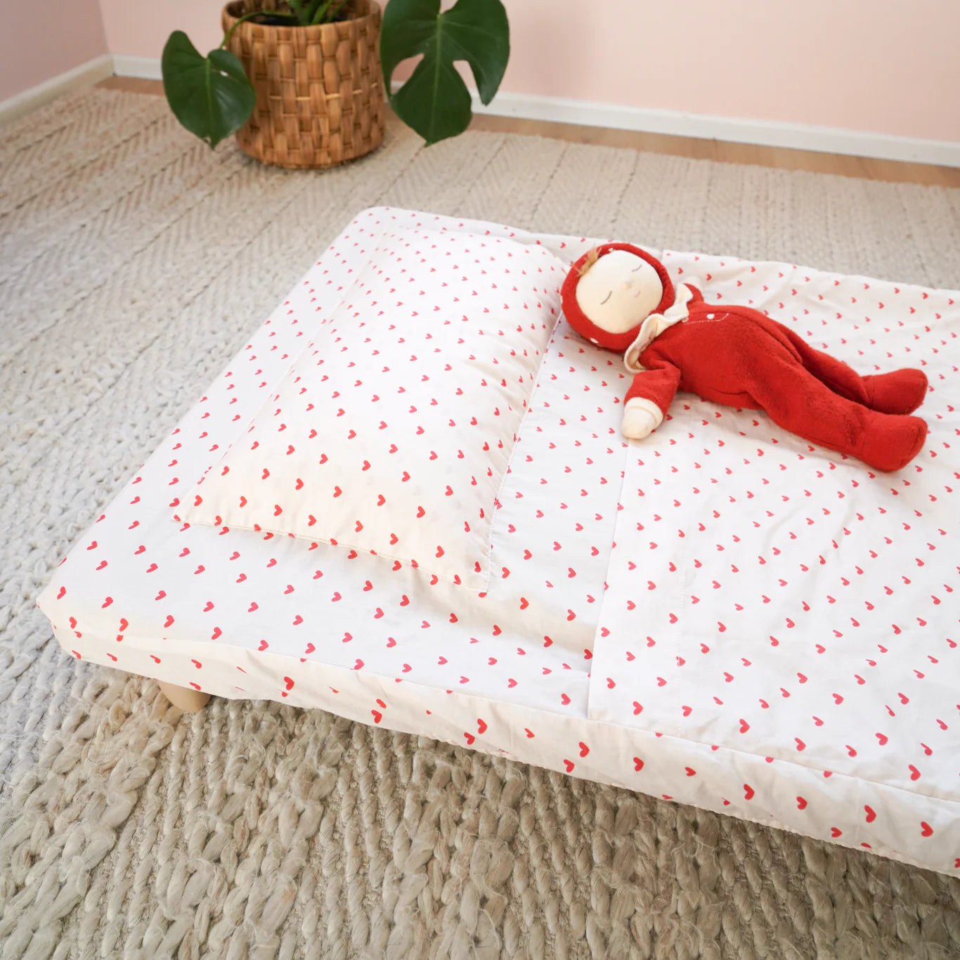 Give your little one the comfort of home during daycare naps with Kinnder’s organic cotton sheet and pillow set—a practical, all-in-one bedding solution designed especially for daycare and kindy rest times.