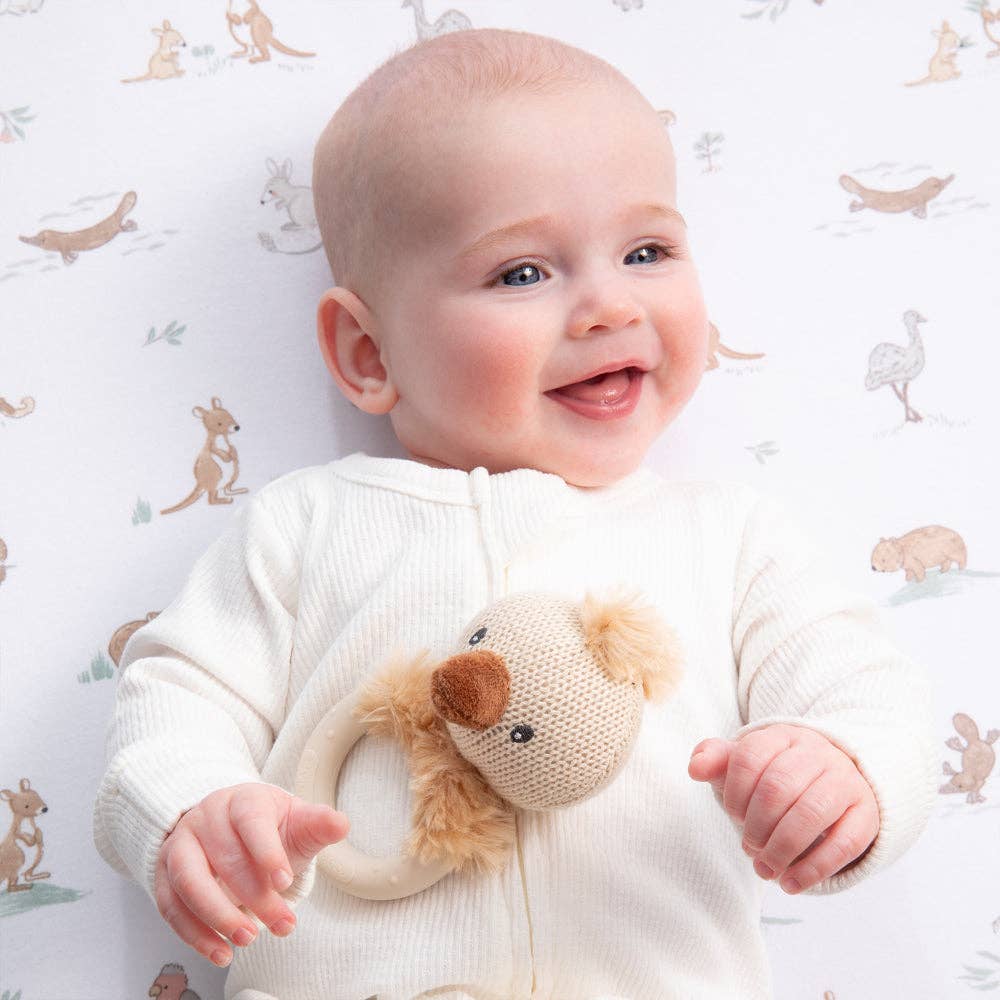 Delight and soothe your little one with our charming Emu Rattle. Crafted from soft cotton knit with a handmade feel, it features a gentle jingle and a BPA-free silicone teether ring - perfect for tiny hands and growing gums.