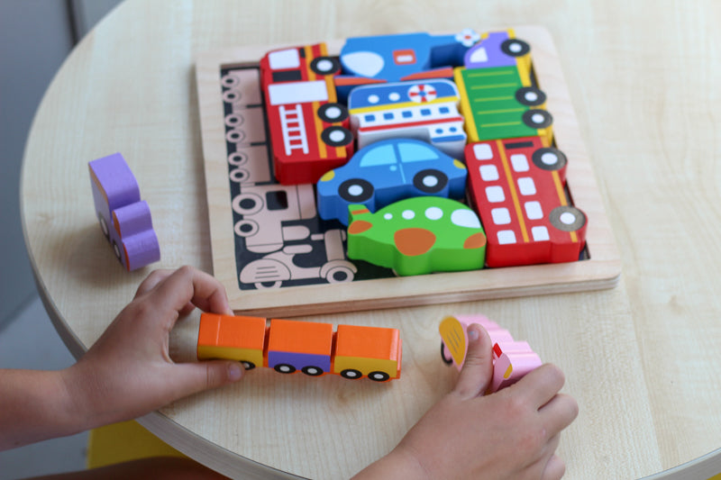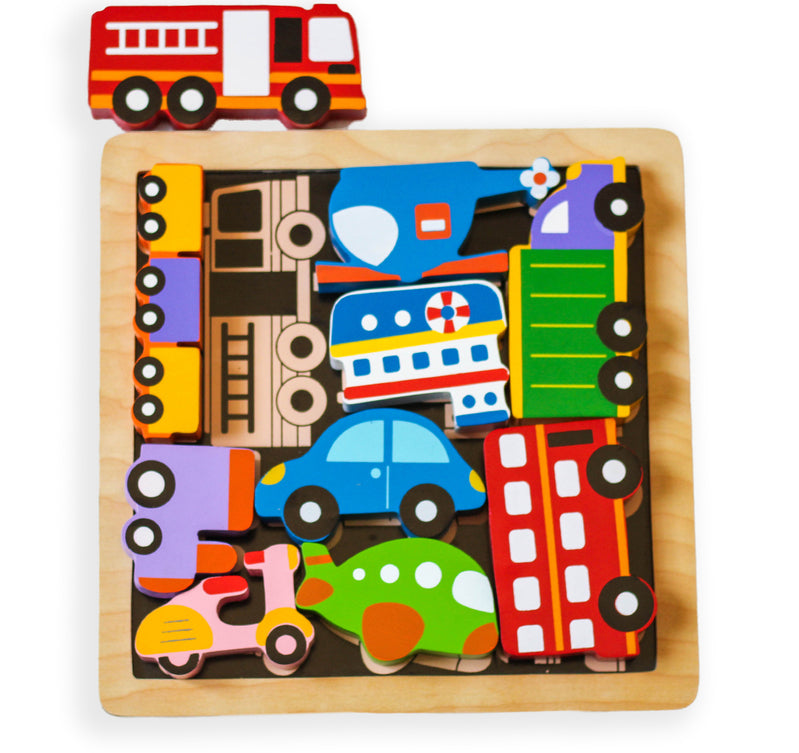 A bright, chunky vehicles puzzle. The design features fantastic solid shapes for young hands to manipulate. Puzzles are a great opportunity to grow your child's gross and fine motor skills, hand and eye coordination, problem-solving, shape and colour recognition skills.